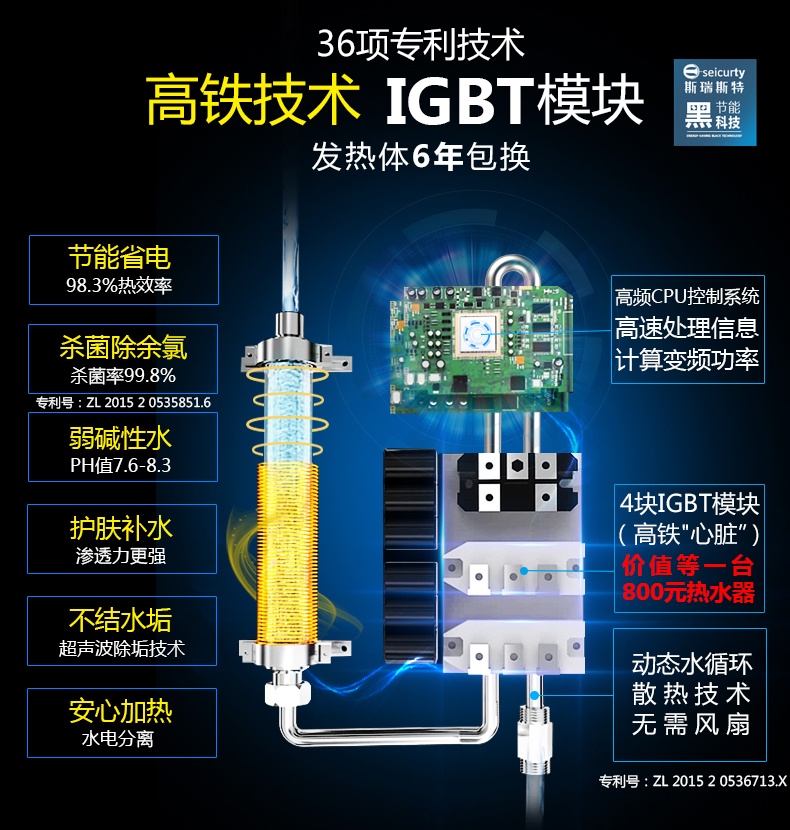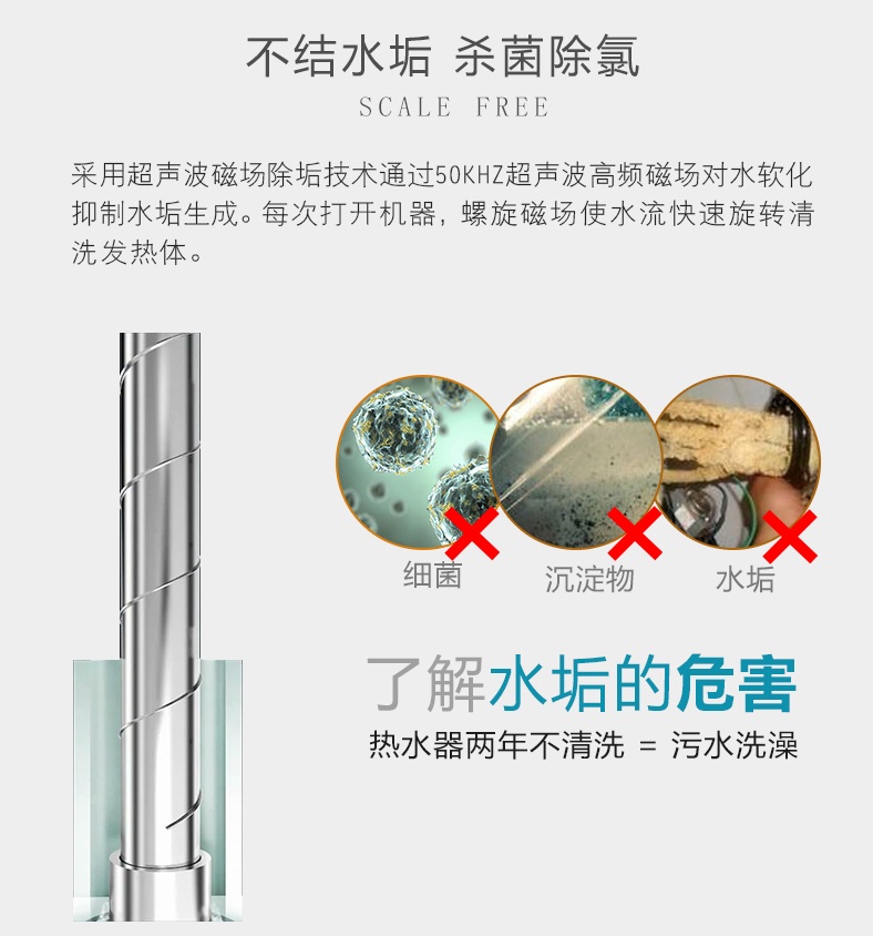斯瑞斯特即熱式磁能熱水器的具有螺旋導(dǎo)流絲專利技術(shù),水流沖刷力提升10倍,每次打開機(jī)器自動(dòng)沖刷水垢;此外還具有超聲波除垢技術(shù),50hz超聲波磁場(chǎng)對(duì)水軟化,抑制水垢生成。